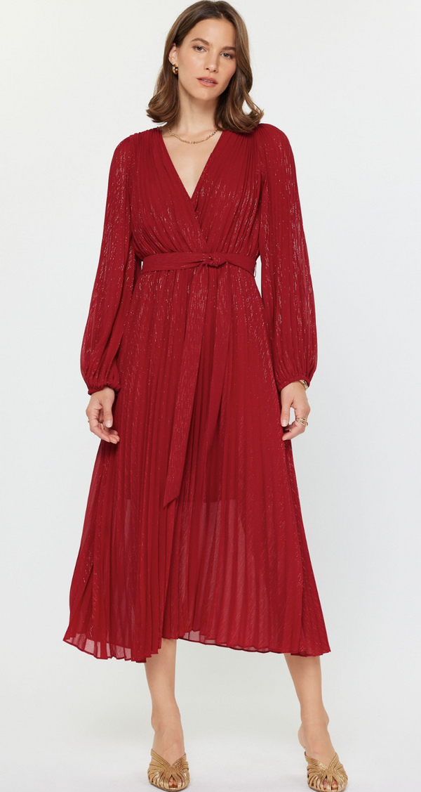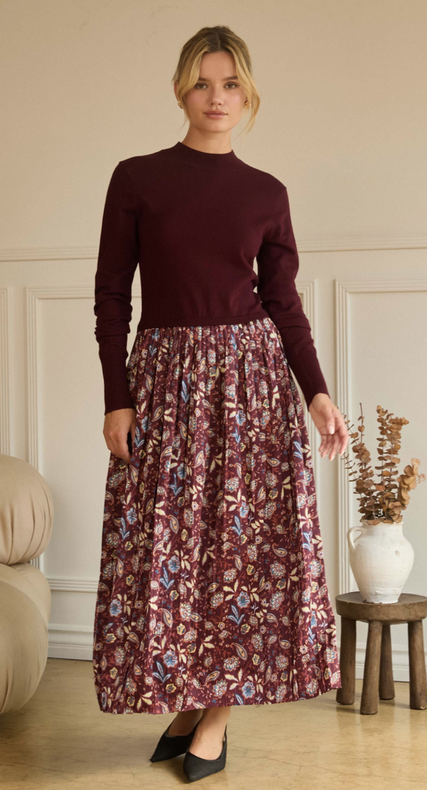 Michelle Knit Top and Pleated Skirt Dress in Burgundy