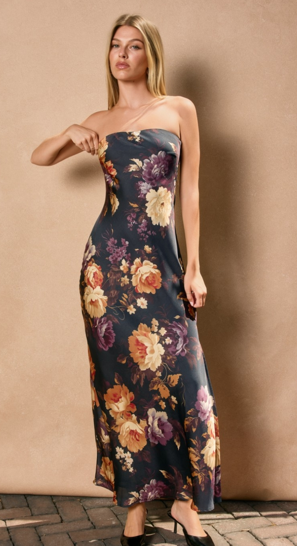 Giselle Strapless Printed Maxi Dress in Dusty Navy