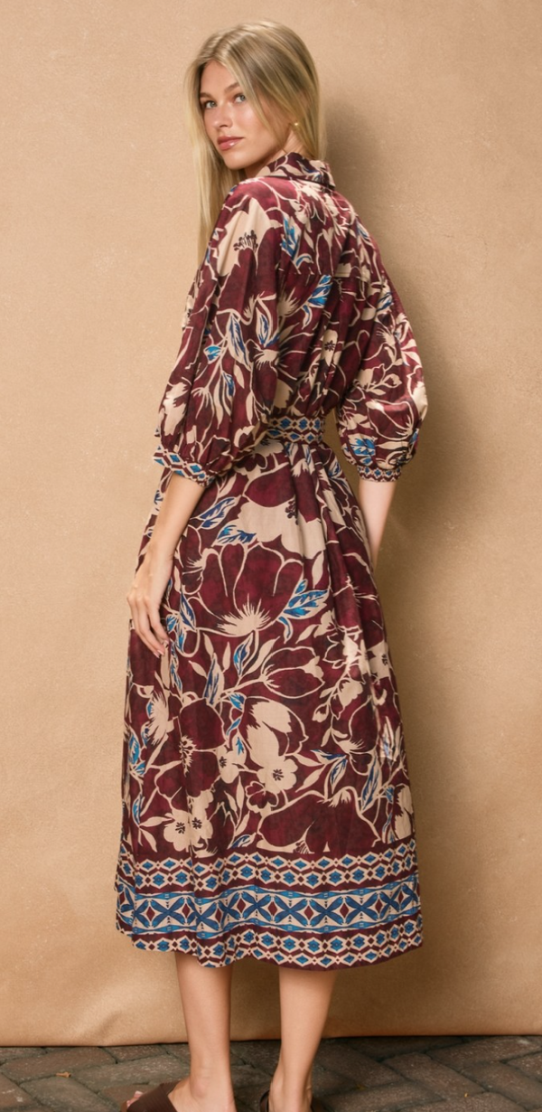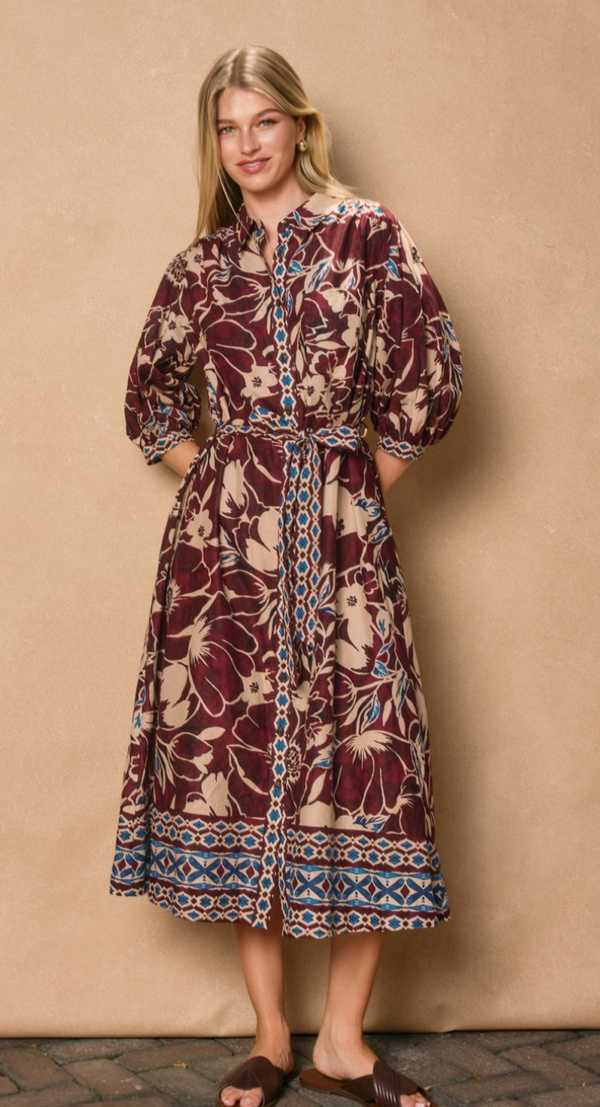 Isla Button Up Shirt Dress in Burgundy and Blue