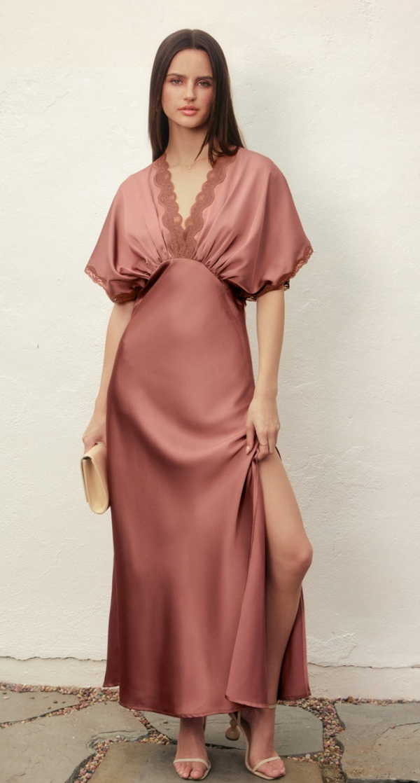 Madison Satin Maxi Dress with Lace Detail in Dark Mauve - FINAL SALE