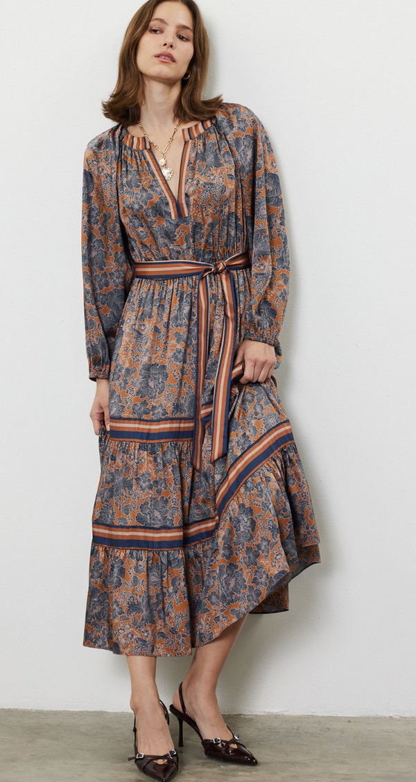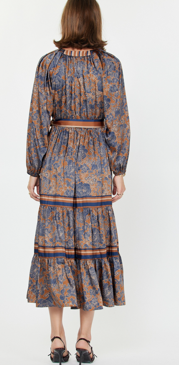 Megan Tiered Midi Dress in Navy and Brown