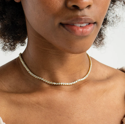 Designer Note: Our Tennis Choker catches the eye with its shimmering and glittering design. This necklace is perfect for special occasions or for adding some sparkle to your everyday wear. A necklace made to make you feel like royalty!