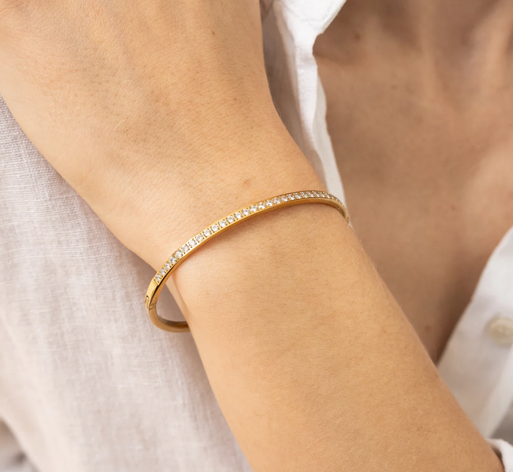 The Diamonds Dainty Bangle is an elegant, timeless piece designed with the highest quality cubic zirconia (CZ) crystals that shine just like real diamonds. This bangle features a sleek and dainty design that sparkles with every movement, perfect for stacking or wearing solo. Whether you’re dressing up for a special occasion or adding some glamour to your everyday look, this bangle is a must-have.