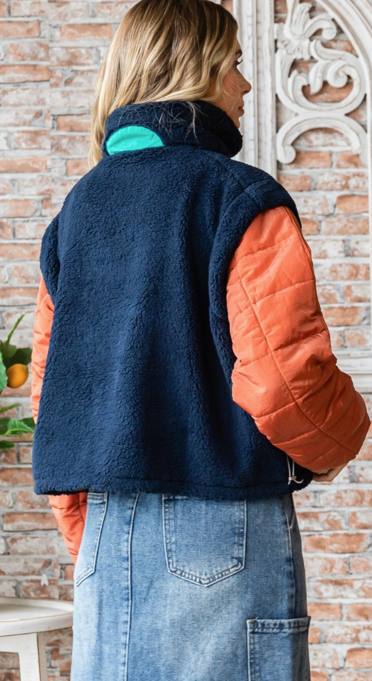 Andy Fleece Pullover with Quilted Sleeves in Navy