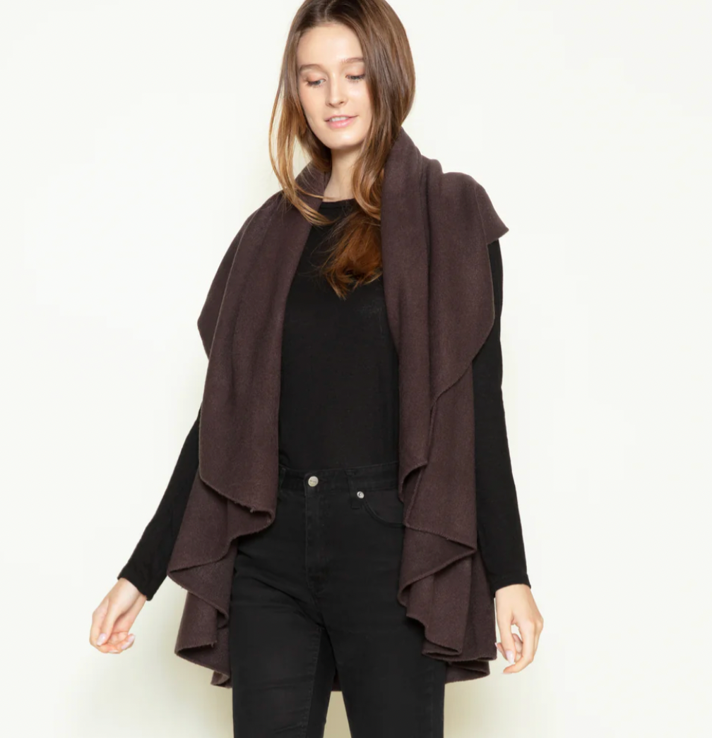 This layering piece has been a bestseller since COCO opened in 2017. Wear it one way and it's scarf-like in front and covers long over your bottom. Flip it around the other way and it's shorter, with a dreamy drape down low, covering your shoulders and arms!