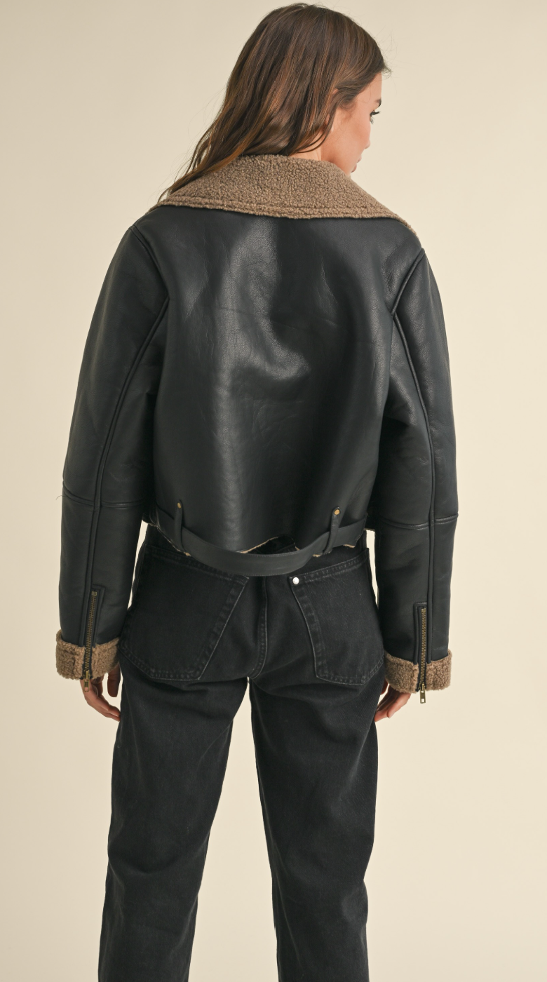 Robbie Vegan Leather Jacket with Sherpa Detail in Black