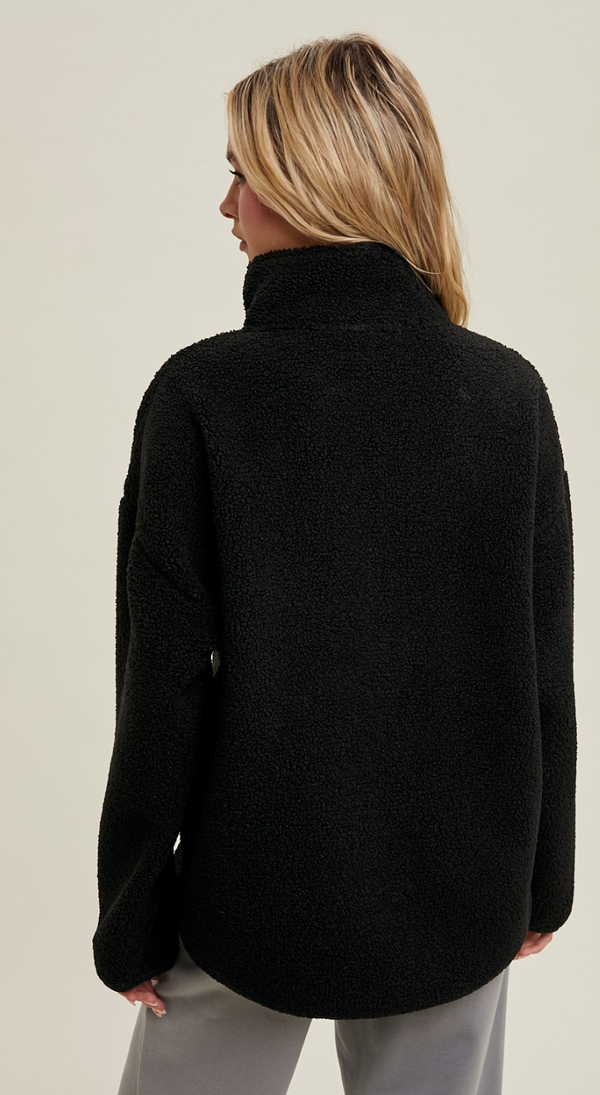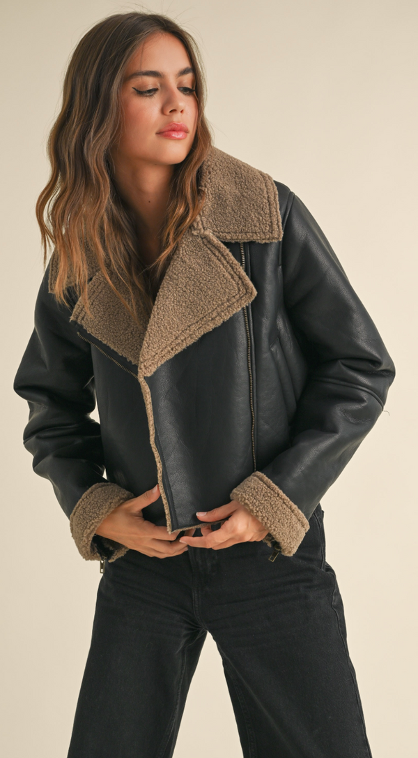 Robbie Vegan Leather Jacket with Sherpa Detail in Black