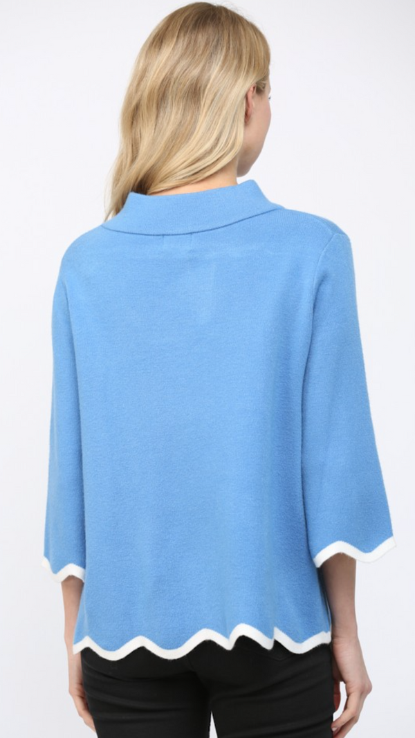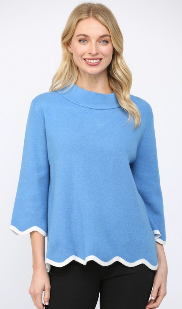 Mock Neck with Scalloped Hems in French Blue and Cream