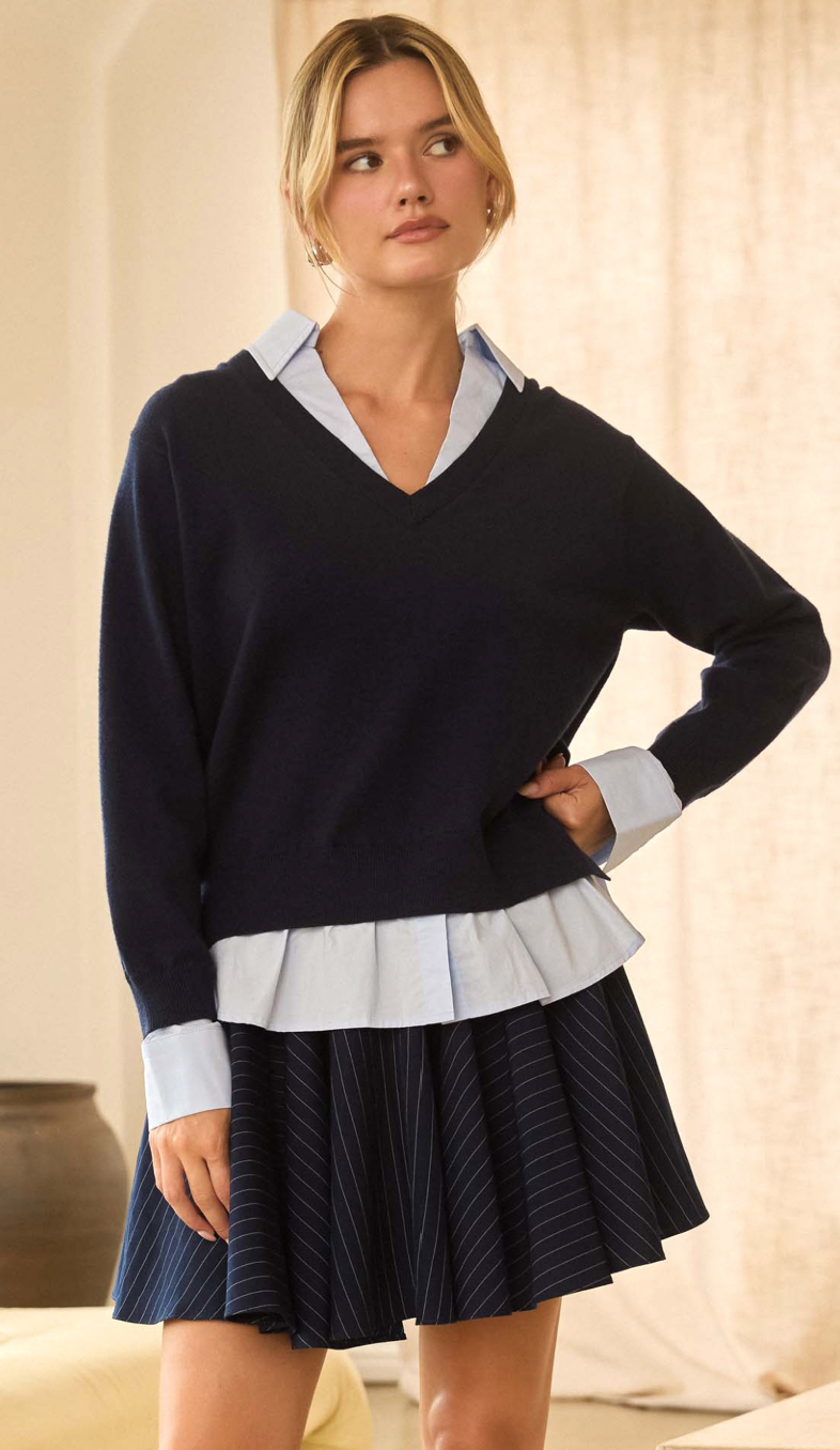Blair Mixed Media Layered Sweater in Navy