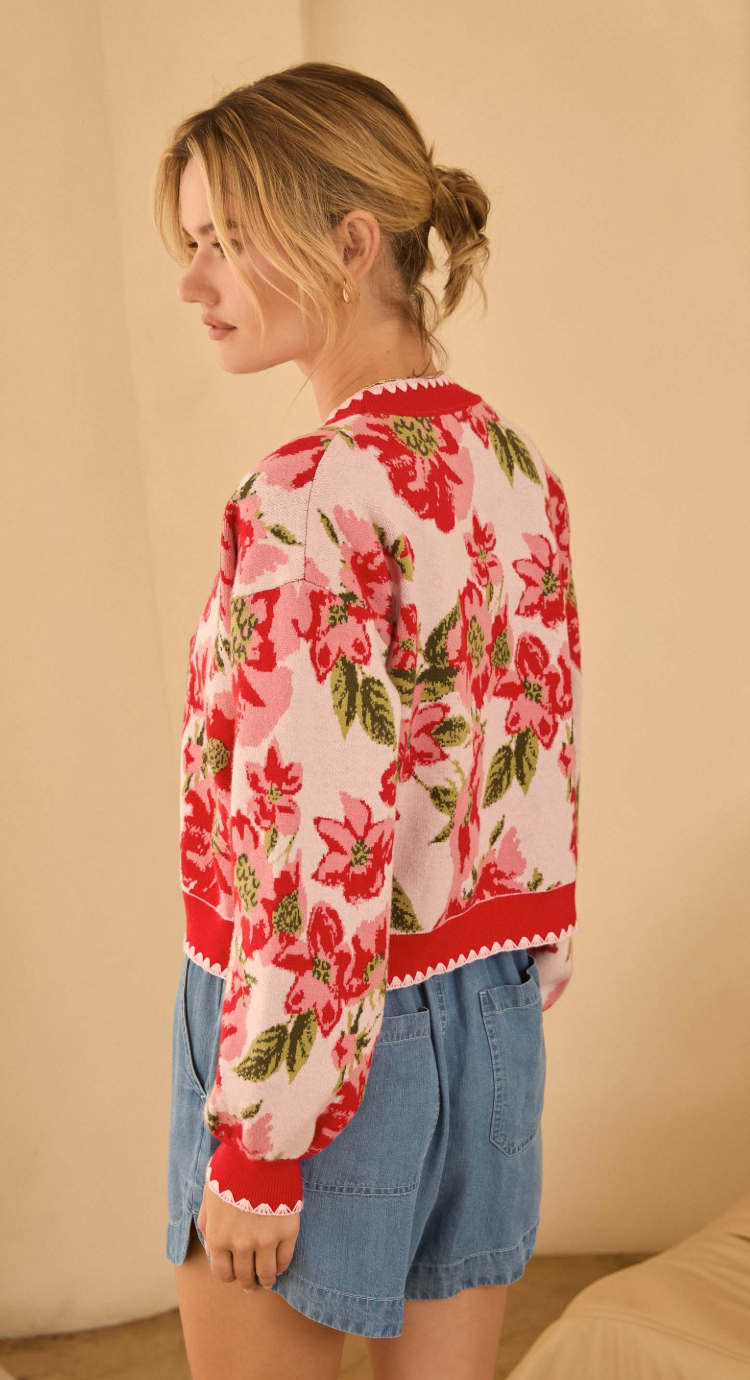 Carly Embroidered Floral Cardigan in Pink and Red