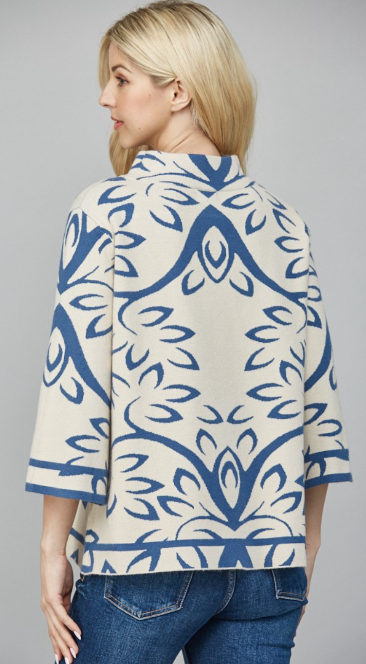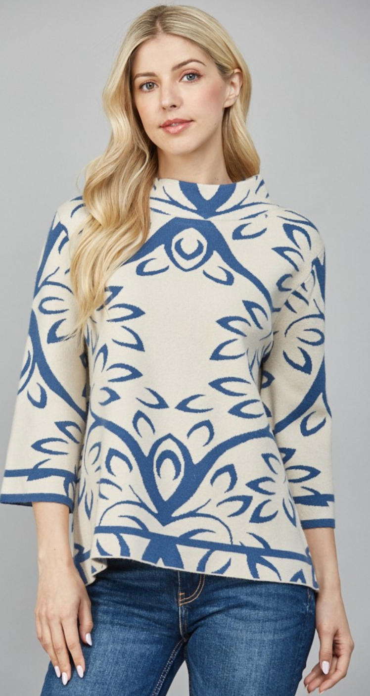 Jacquard Print Mock Neck in Cream and Teal