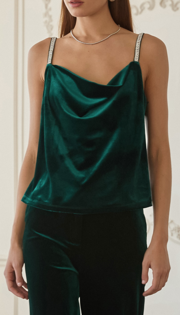 Tori Velvet Cami with Rhinestone Straps in Evergreen