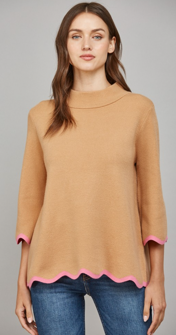 Mock Neck with Scalloped Hems in Camel
