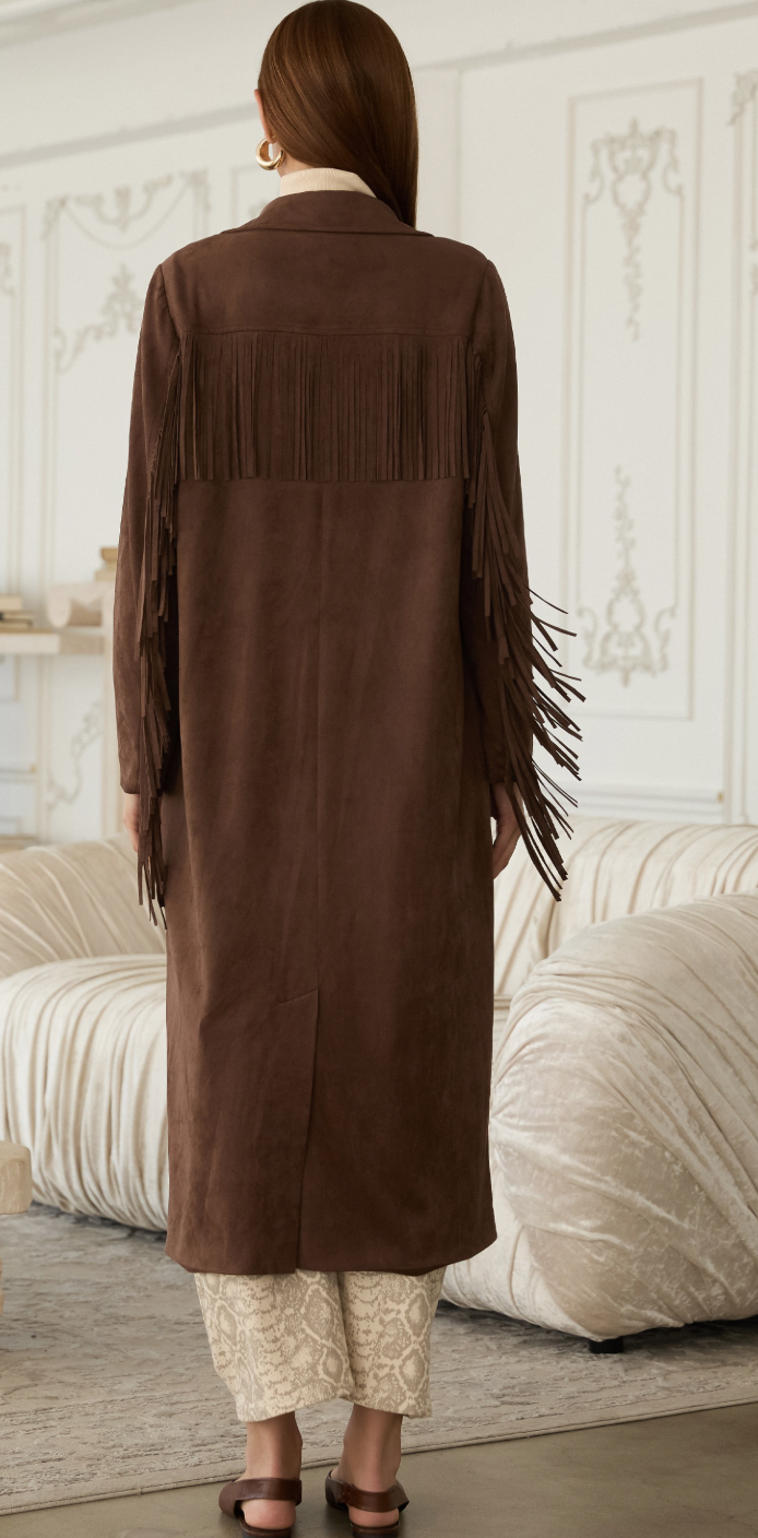 Vera Faux Suede Coat with Fringe Detail in Brown- FINAL SALE